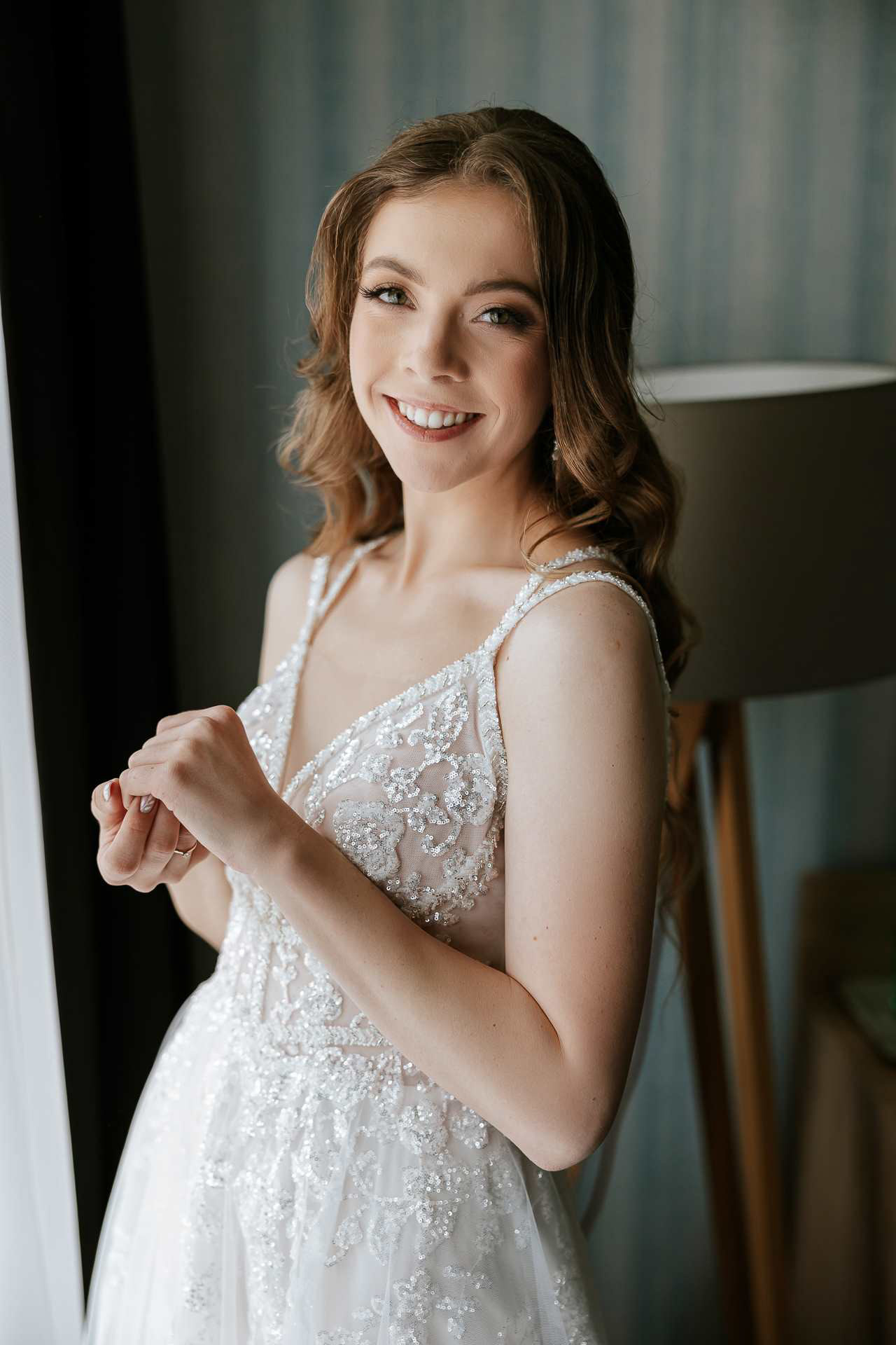 Przygotowania Julii odbyły się w innym apartamencie. Julia, piękna i pełna pozytywnej energii osoba, emanuje pozytywnymi emocjami na fotografiach! Razem ze świadkową Kasią stworzyły wspaniałe sytuacje i mnóstwo okazji do stworzenia wyśmienitych kadrów. Szybka sesja w szlafrokach, kieliszek musującego wina i Julia była gotowa wskoczyć w swoją piękną, ozdobną, delikatną i zwiewną suknię ślubną!