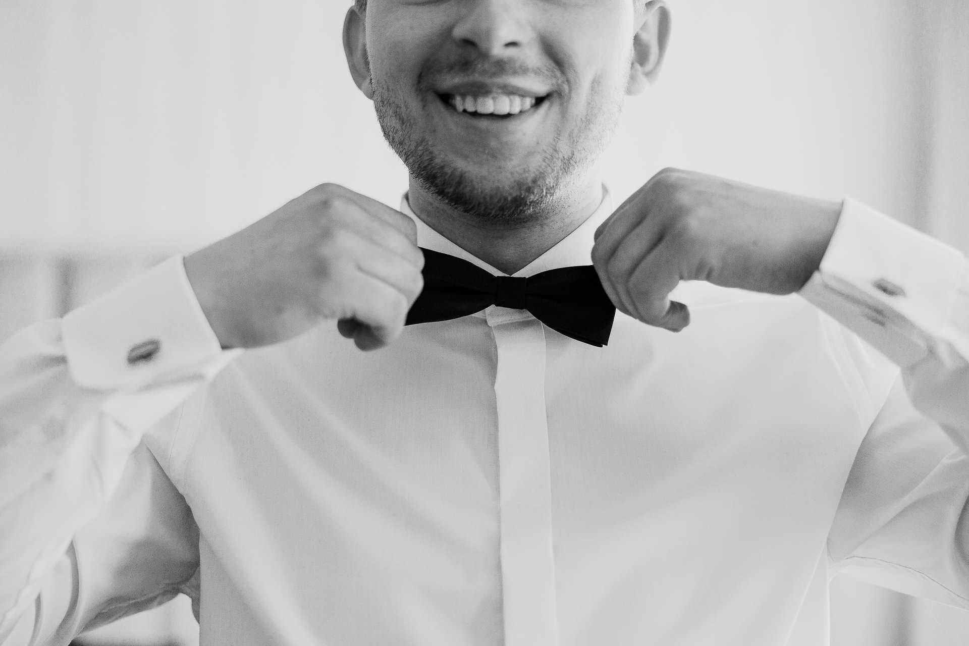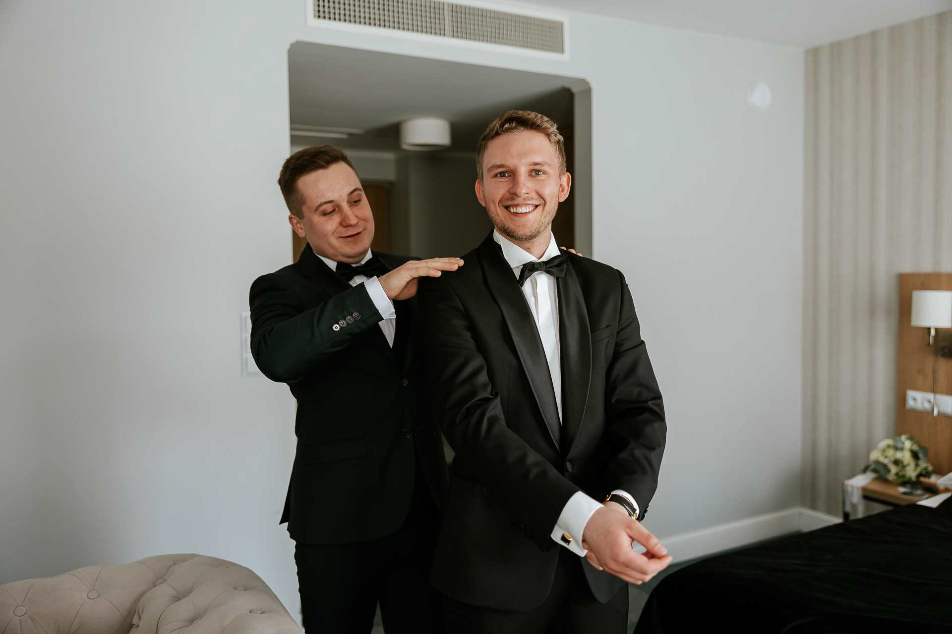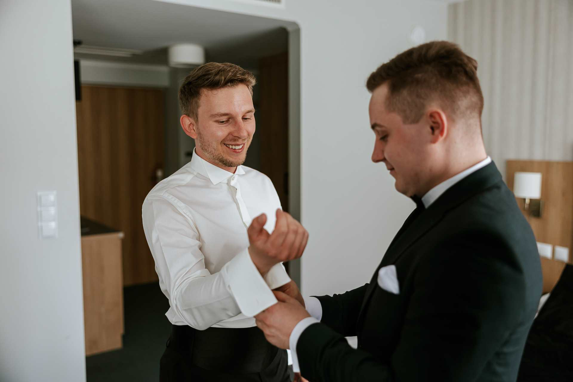Fotografia przygotowań to kluczowy element, pozwalający zatrzymać piękne emocje na zdjęciach. Zaczęliśmy od fotografowania Pana Młodego. Bartosz wybrał elegancki smoking z pasem, idealnie do niego pasujący. Oczywiście nie mogło zabraknąć szklaneczki whisky wypitej w świetnej atmosferze wraz ze świadkiem Grzegorzem!