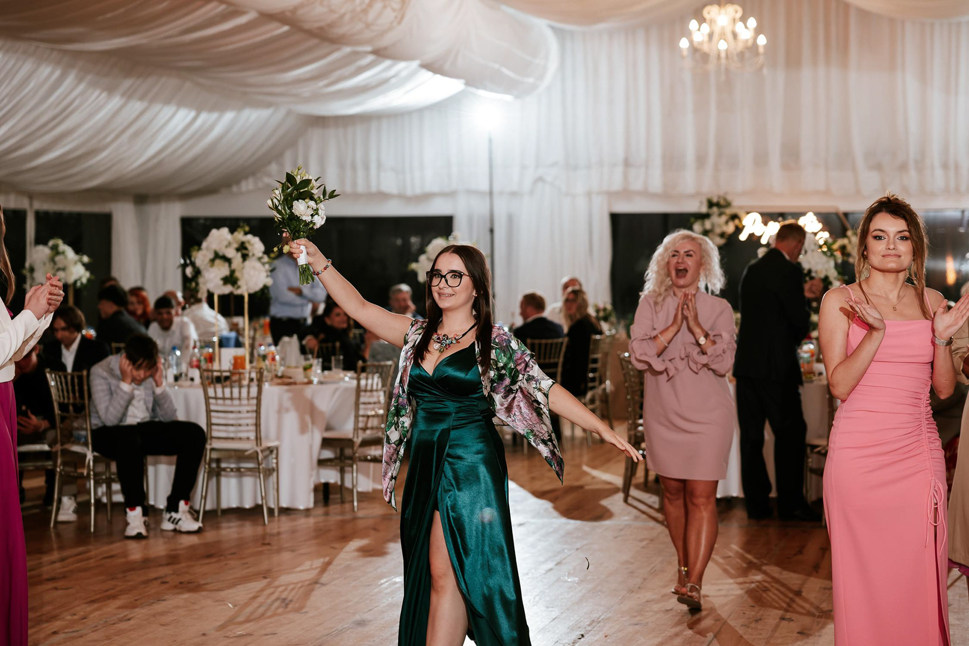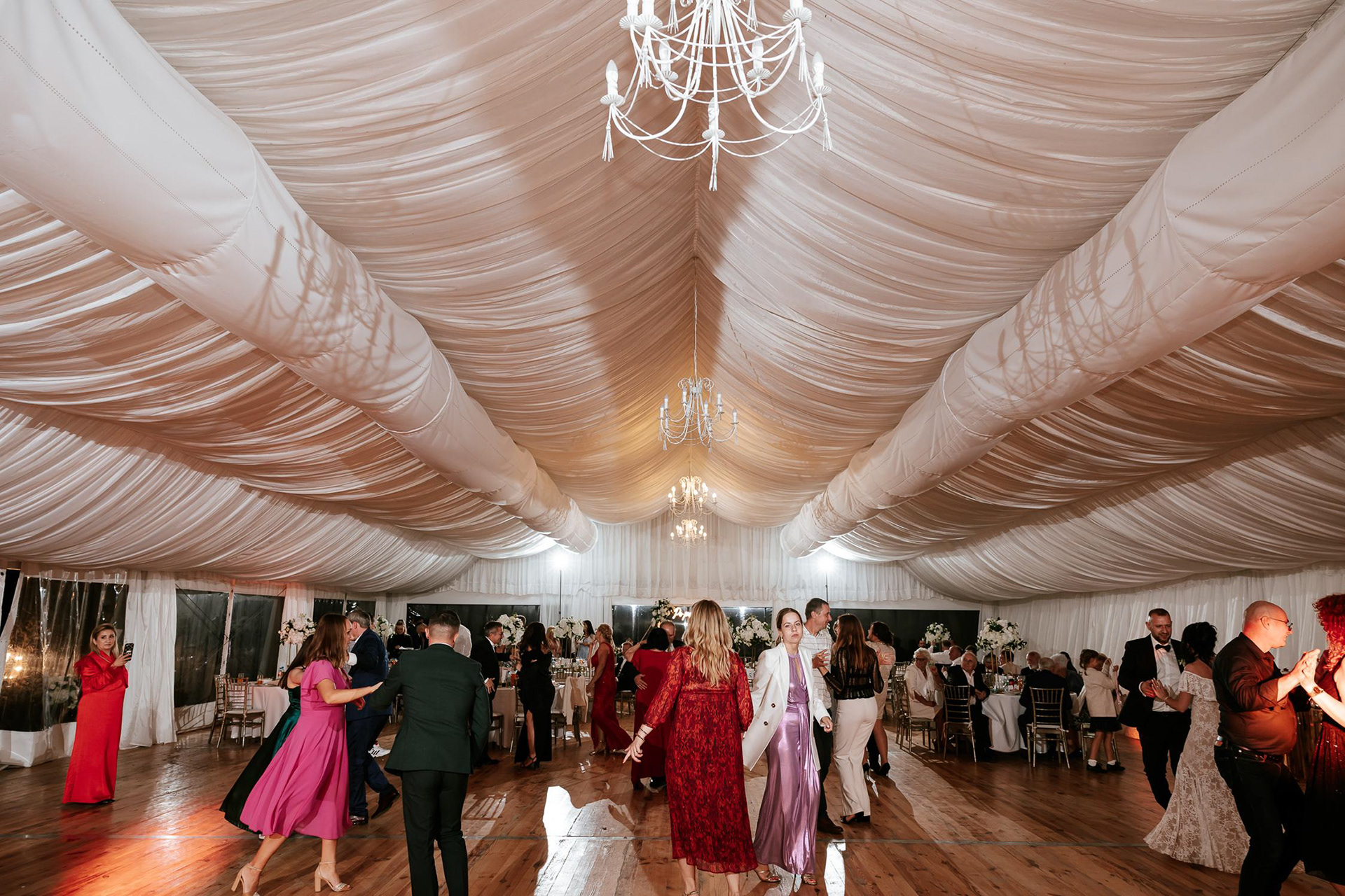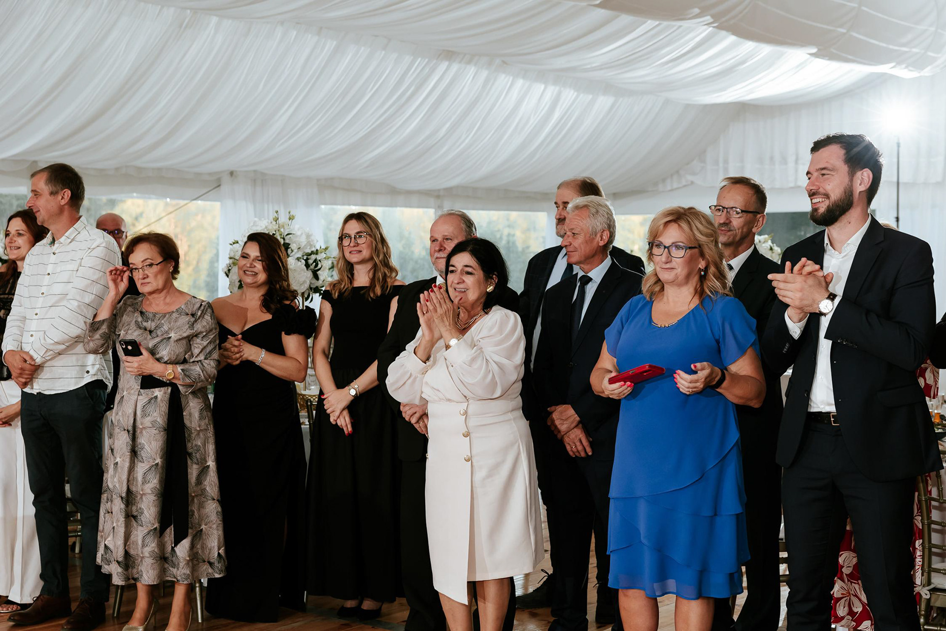 Po wzruszającej ceremonii goście przenieśli się do fantastycznego namiotu weselnego, gdzie rozpoczęła się prawdziwa impreza! Wesele w namiocie w Dworze Zbożenna to był prawdziwy pokaz energii – parkiet rozgrzany do czerwoności, radość i mnóstwo niezapomnianych momentów. Nie zabrakło wyjątkowych atrakcji, takich jak retro foto bus, krojenie tortu weselnego na zewnątrz i zimne ognie, które dodały blasku tej niezwykłej nocy. Jednak największe wrażenie na gościach zrobiła niespodzianka Panny Młodej, która zaśpiewała na żywo dla swojego męża, oj nie jednej osobie popłynęła łezka wzruszenia!