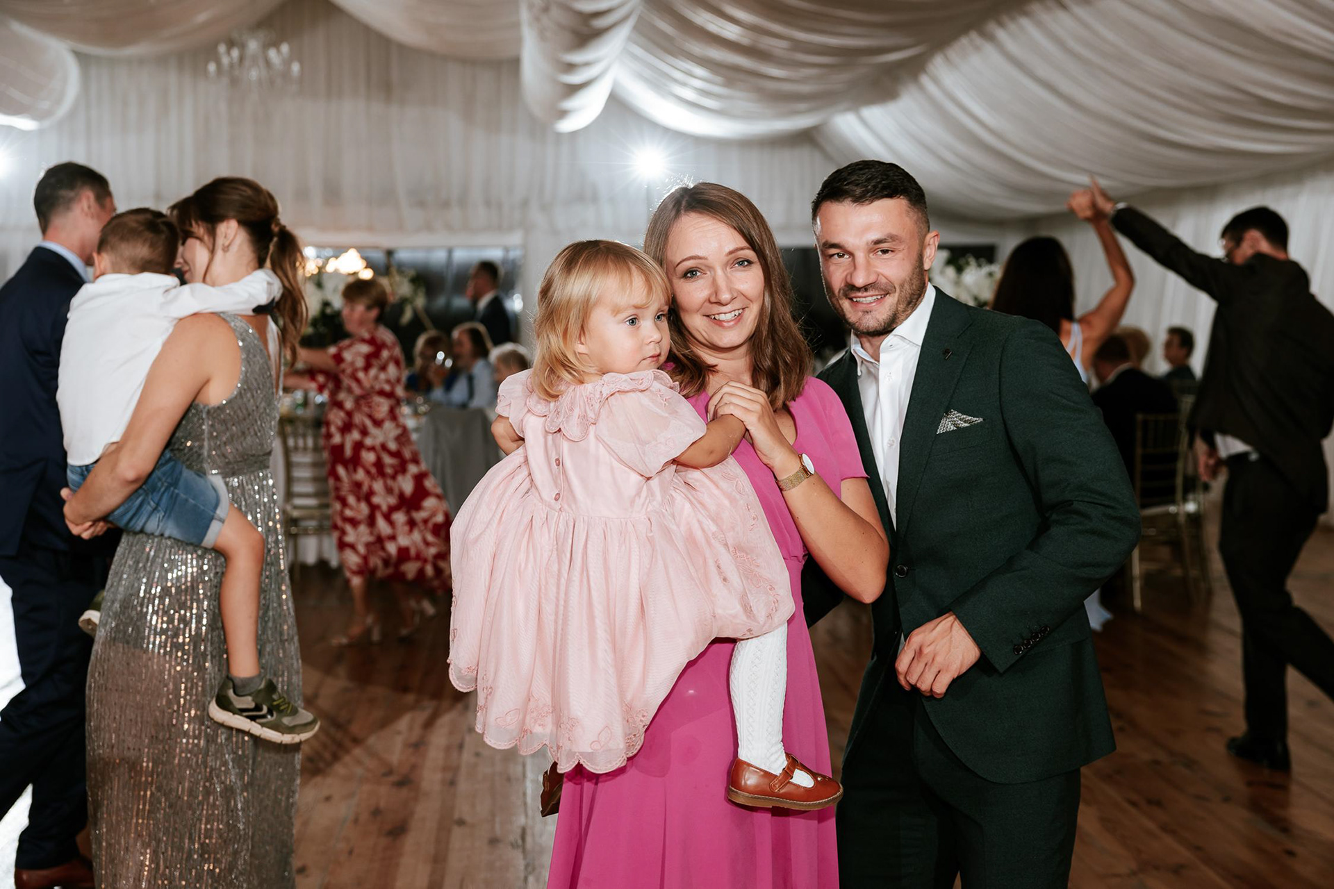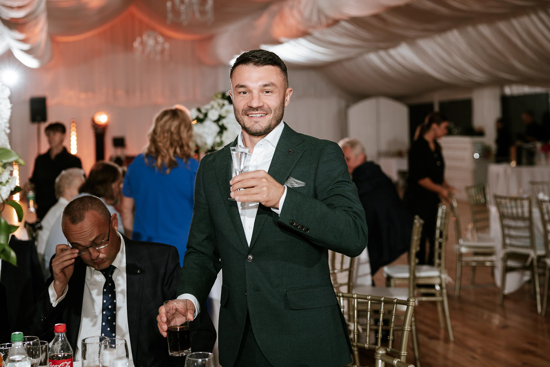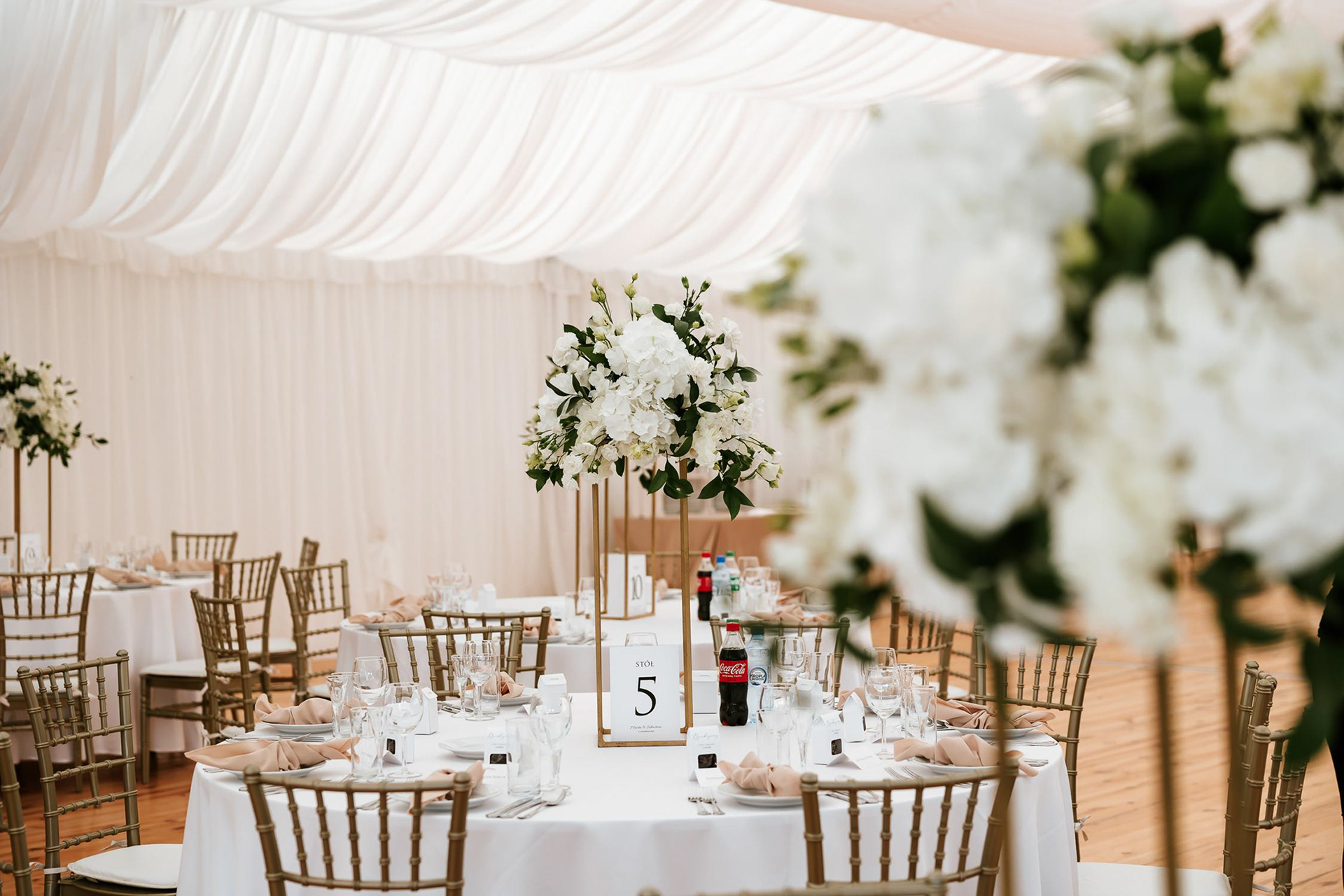 Po wzruszającej ceremonii goście przenieśli się do fantastycznego namiotu weselnego, gdzie rozpoczęła się prawdziwa impreza! Wesele w namiocie w Dworze Zbożenna to był prawdziwy pokaz energii – parkiet rozgrzany do czerwoności, radość i mnóstwo niezapomnianych momentów. Nie zabrakło wyjątkowych atrakcji, takich jak retro foto bus, krojenie tortu weselnego na zewnątrz i zimne ognie, które dodały blasku tej niezwykłej nocy. Jednak największe wrażenie na gościach zrobiła niespodzianka Panny Młodej, która zaśpiewała na żywo dla swojego męża, oj nie jednej osobie popłynęła łezka wzruszenia!