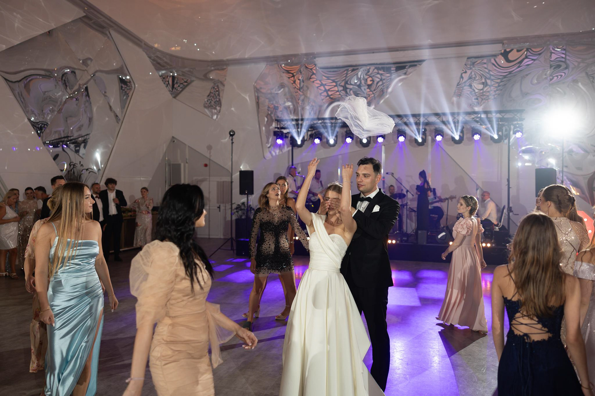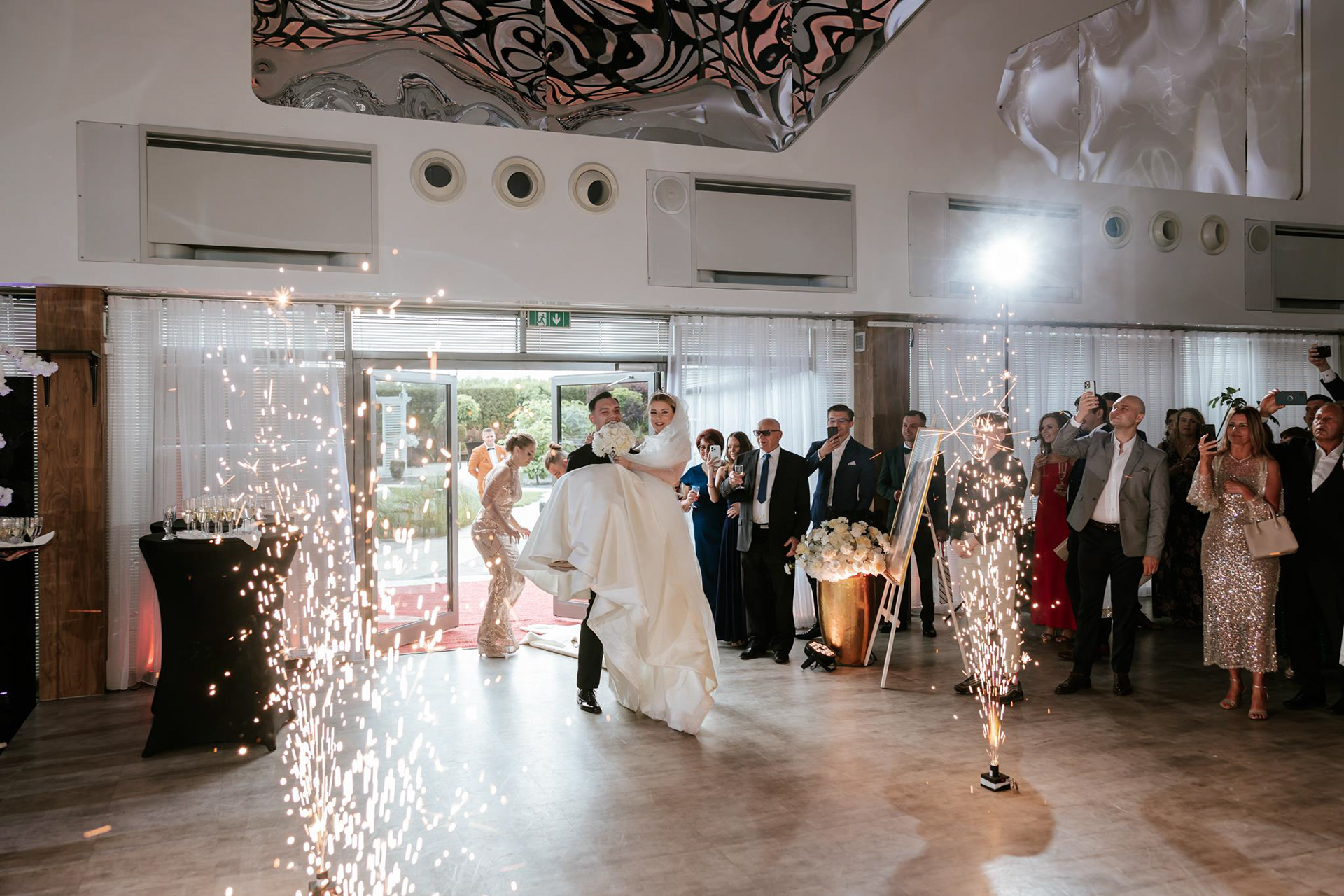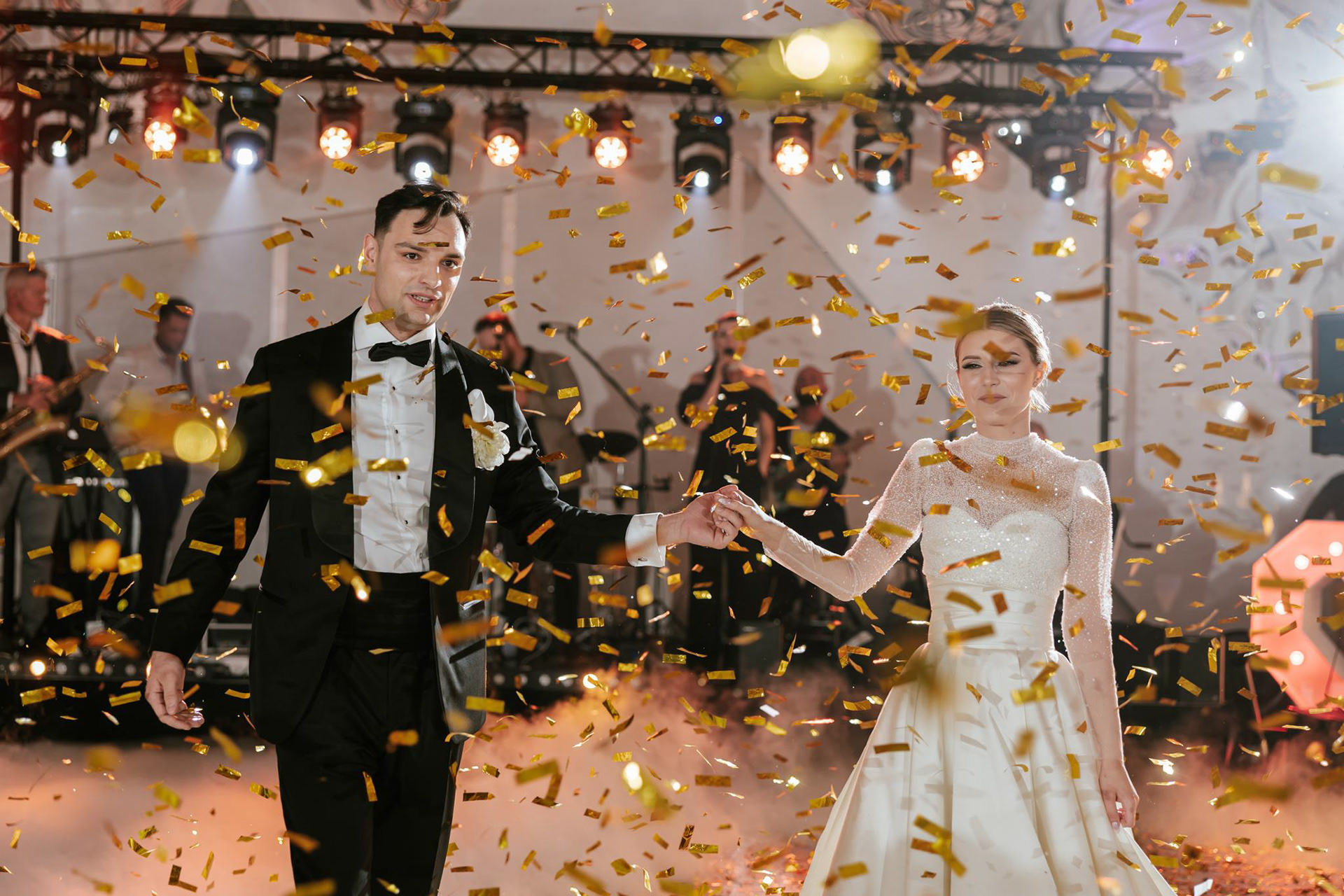 Wesele Sonii i Tomka odbyło się w Hotelu Porto, który był perfekcyjnie dopasowany do klimatu ślubu glamour. Dekoracje w złoto-białej kolorystyce z czarnymi akcentami, luksusowa zastawa i mnóstwo świeżych, białych kwiatów – to wszystko stworzyło atmosferę pełną klasy i elegancji. Szczególnie warte uwagi było wyjątkowe oświetlenie, za które odpowiadała ekipa Modern Light Service. Profesjonalne oświetlenie sali weselnej dodało głębi zdjęciom i podkreśliło luksusowy klimat przyjęcia.
