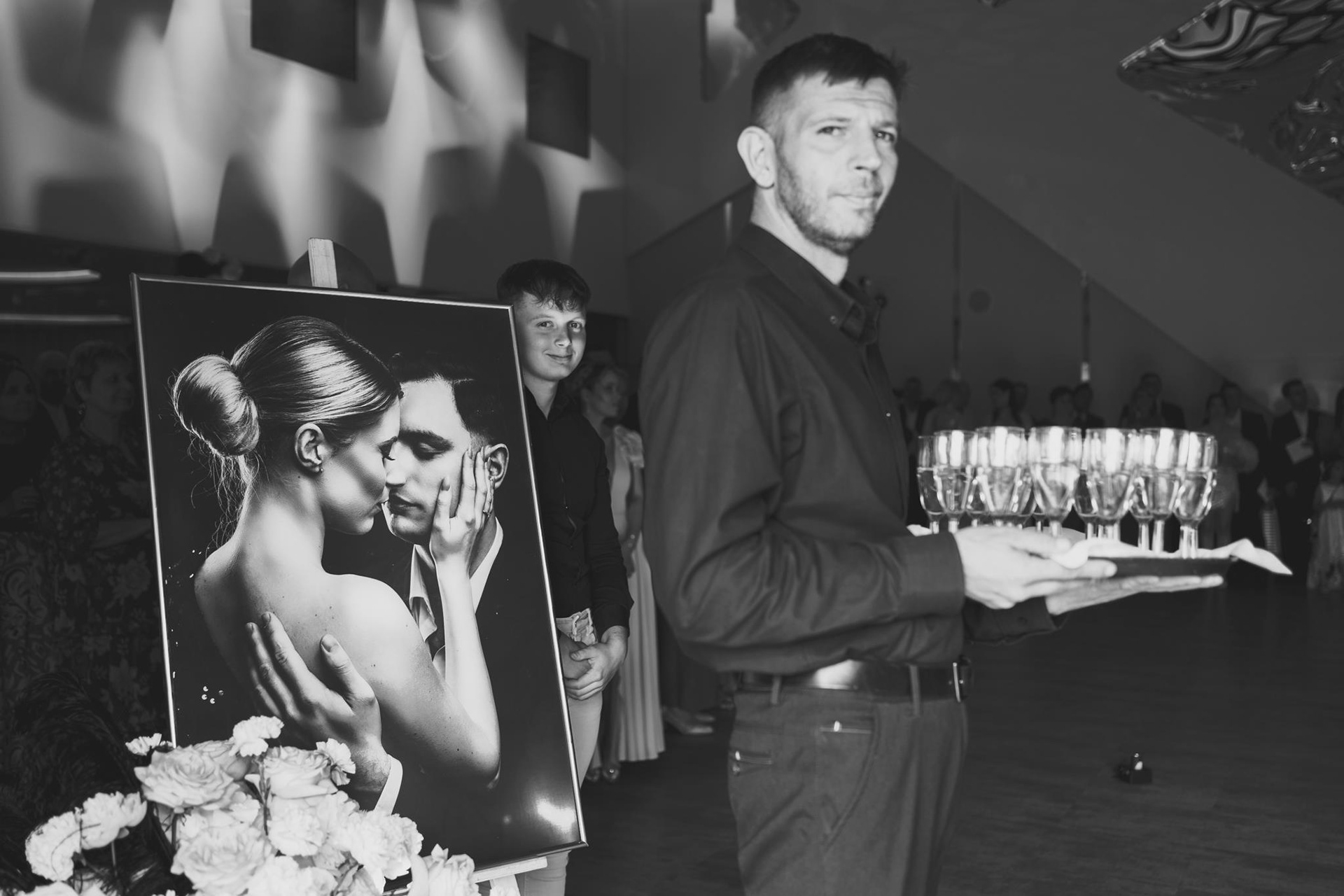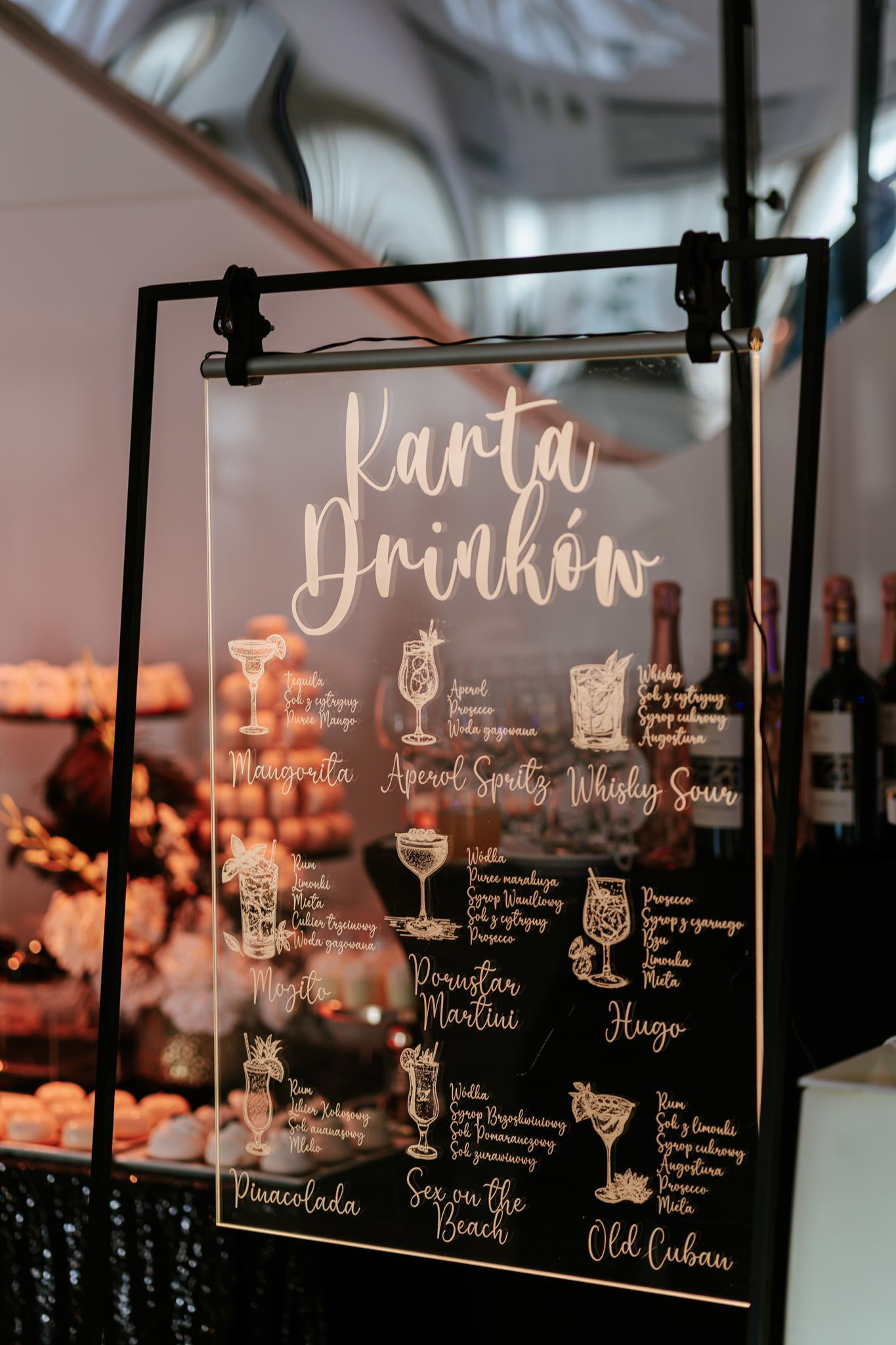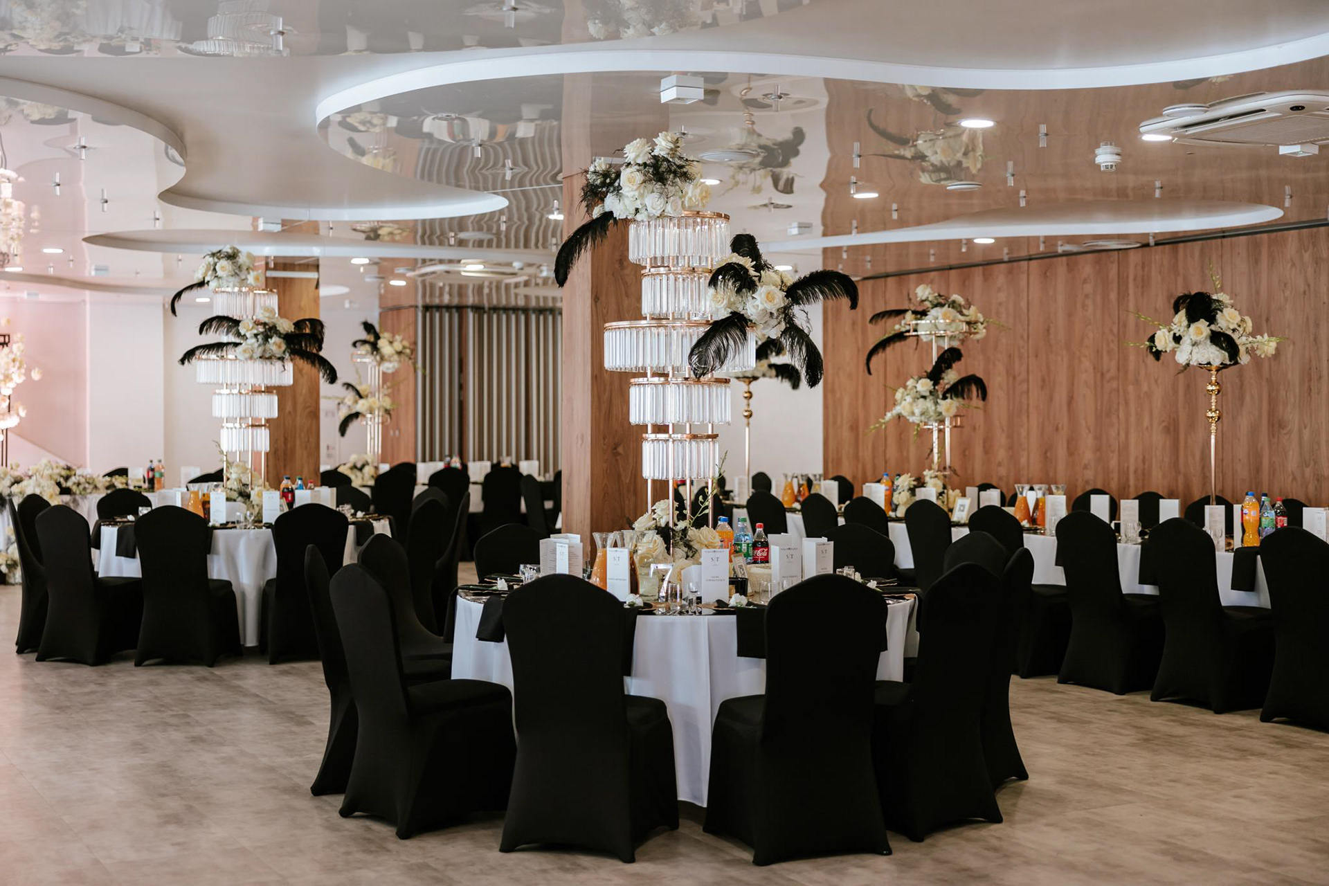 Wesele Sonii i Tomka odbyło się w Hotelu Porto, który był perfekcyjnie dopasowany do klimatu ślubu glamour. Dekoracje w złoto-białej kolorystyce z czarnymi akcentami, luksusowa zastawa i mnóstwo świeżych, białych kwiatów – to wszystko stworzyło atmosferę pełną klasy i elegancji. Szczególnie warte uwagi było wyjątkowe oświetlenie, za które odpowiadała ekipa Modern Light Service. Profesjonalne oświetlenie sali weselnej dodało głębi zdjęciom i podkreśliło luksusowy klimat przyjęcia.