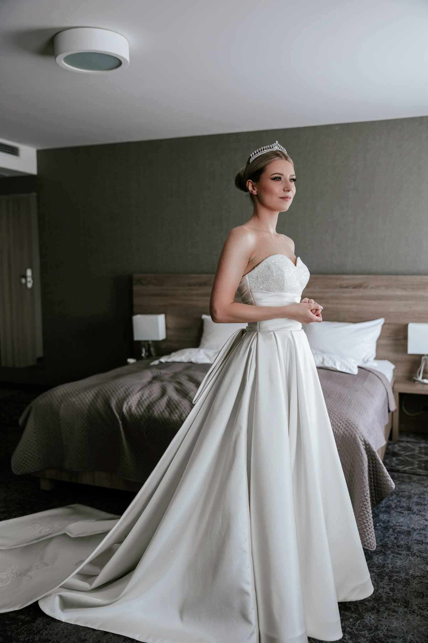 Dzień rozpoczął się od przygotowań Pary Młodej. Najpierw fotografowaliśmy przygotowania Pana Młodego, które odbyły się w jego rodzinnym domu – ciepłe, naturalne światło i domowa atmosfera pozwoliły uchwycić klimatyczne kadry pełne emocji. Panna Młoda przygotowywała się w pokoju hotelowym Hotelu Porto (województwo łódzkie), co miało ogromną zaletę – wszystko odbywało się w jednym miejscu, co zmniejszyło stres, skróciło czas dojazdów i pozwoliło skupić się na przeżywaniu chwili. Sonia olśniewała już od pierwszych chwil – warto podkreślić, że miała na sobie wyjątkową suknię ślubną własnego projektu, której elegancki krój i subtelne detale idealnie wpisywały się w klimat całej uroczystości.